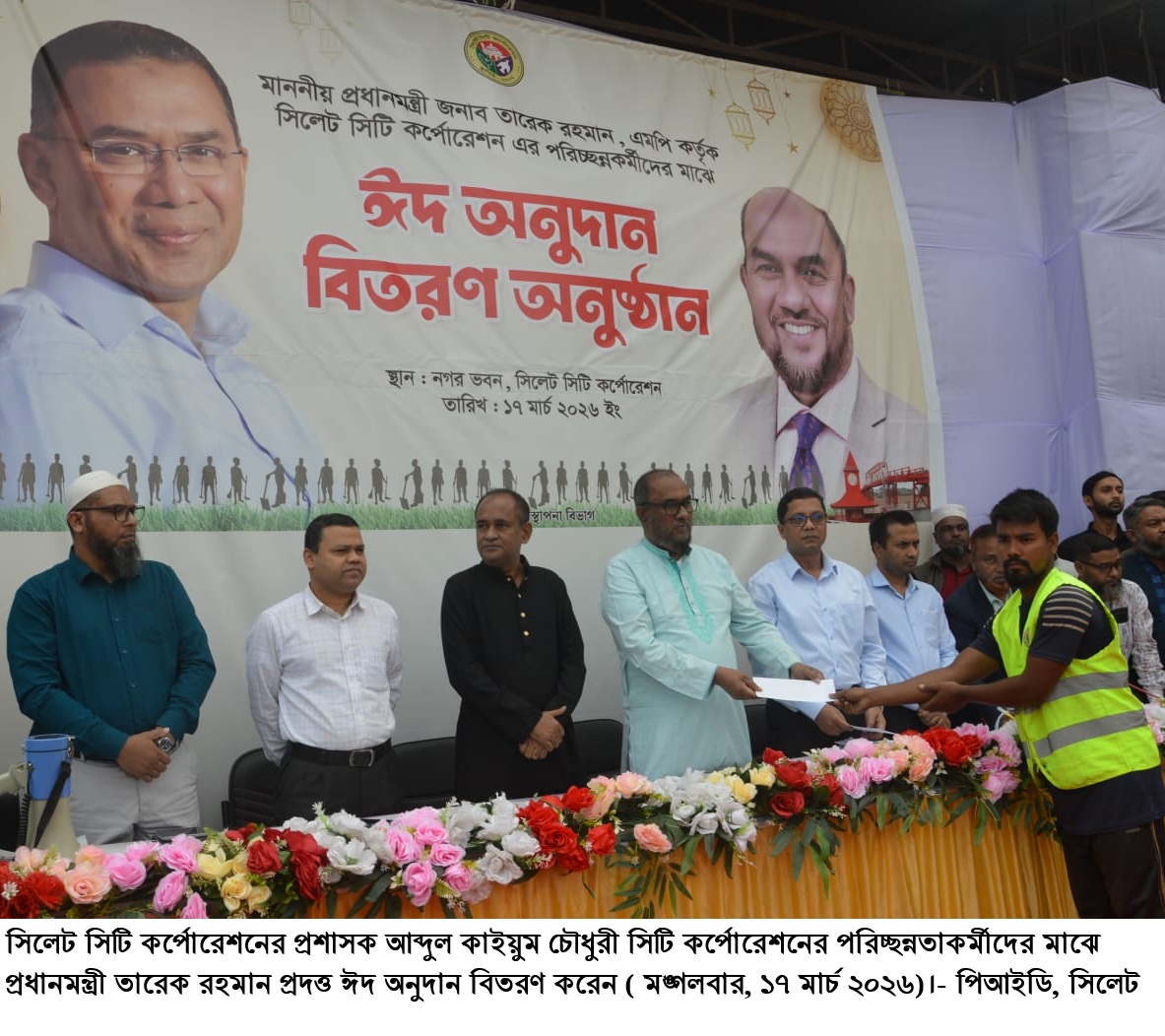 এখন সিলেট ডেক্স :: পবিত্র ঈদুল ফিতর উপলক্ষে সিলেট সিটি কর্পোরেশনের (সিসিক) বর্জ্য ব্যবস্থাপনায় নিয়োজিত পরিচ্ছন্নতাকর্মীদের মাঝে প্রধানমন্ত্রী তারেক রহমান প্রদত্ত ঈদ অনুদান বিতরণ করা হয়েছে। আজ (মঙ্গলবার) নগরভবন প্রাঙ্গণে আয়োজিত অনুষ্ঠানে সিসিক প্রশাসক আব্দুল কাইয়ুম চৌধুরী ৮২৭ জন পরিচ্ছন্নতাকর্মীর প্রত্যেকের হাতে নগদ ৫ হাজার টাকা করে মোট ৪১ লাখ ৩৫ হাজার টাকা তুলে দেন।