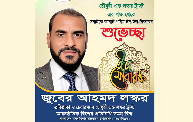 সিলেটসহ দেশ ও বিদেশে অবস্থানরত সকল ধর্মপ্রাণ মুসলমানকে পবিত্র ঈদুল ফিতরের শুভেচ্ছা জানিয়েছেন চৌধুরী এন্ড লস্কর ট্রাস্টের প্রতিষ্ঠাতা ও চেয়ারম্যান এবং বাংলাদেশ মানবাধিকার বাস্তবায়ন ফাউন্ডেশন (বিএমবিএফ) এর আন্তর্জাতিক বিশেষ প্রতিনিধি (সমগ্র বিশ্ব) জুবের আহমদ লস্কর।