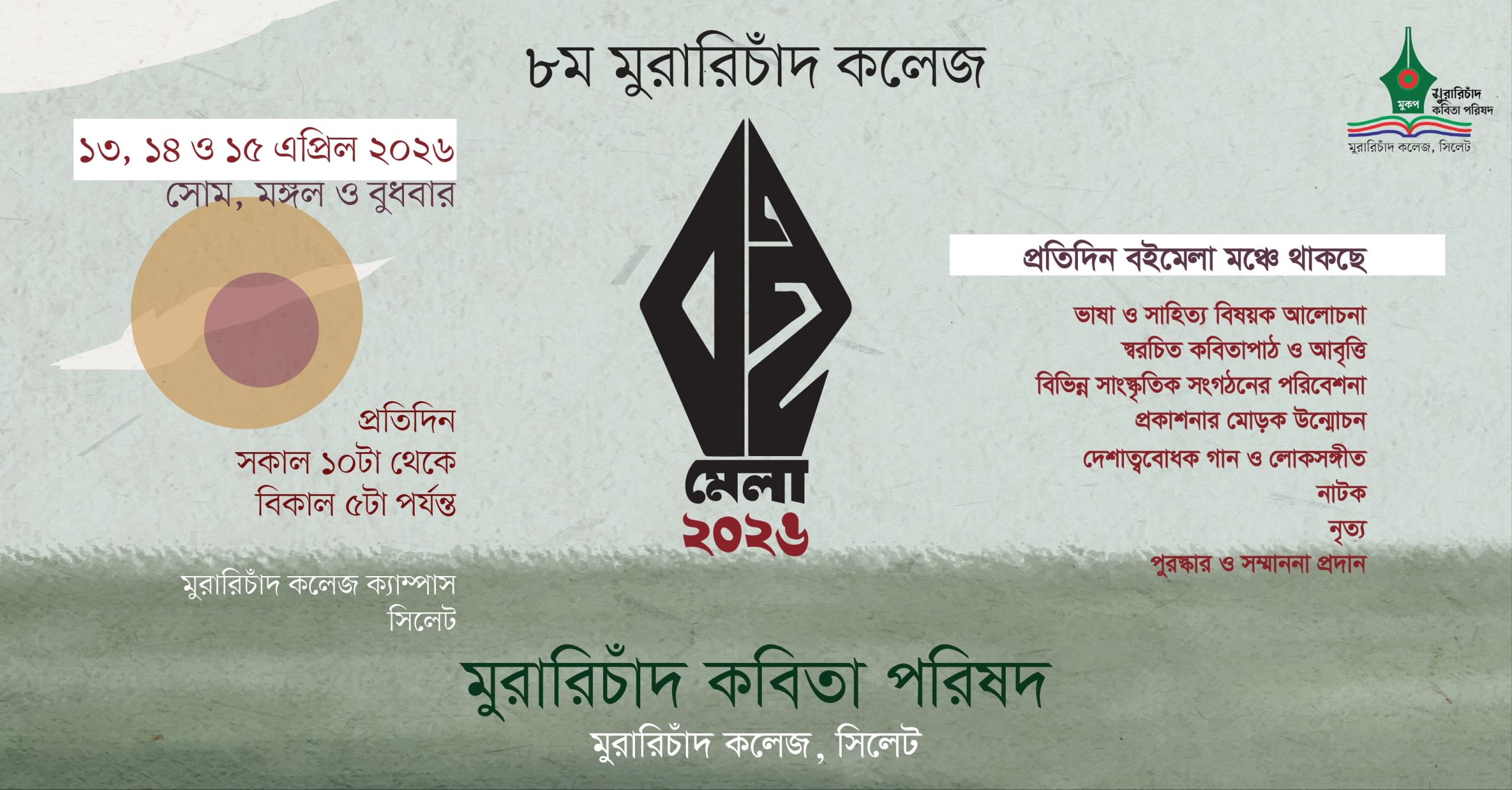 কলেজের সাহিত্য ও সাংস্কৃতিক সংগঠন মুরারিচাঁদ কবিতা পরিষদের উদ্যোগে আয়োজিত এ মেলায় বই বিক্রির পাশাপাশি থাকবে নানা সাংস্কৃতিক আয়োজন।